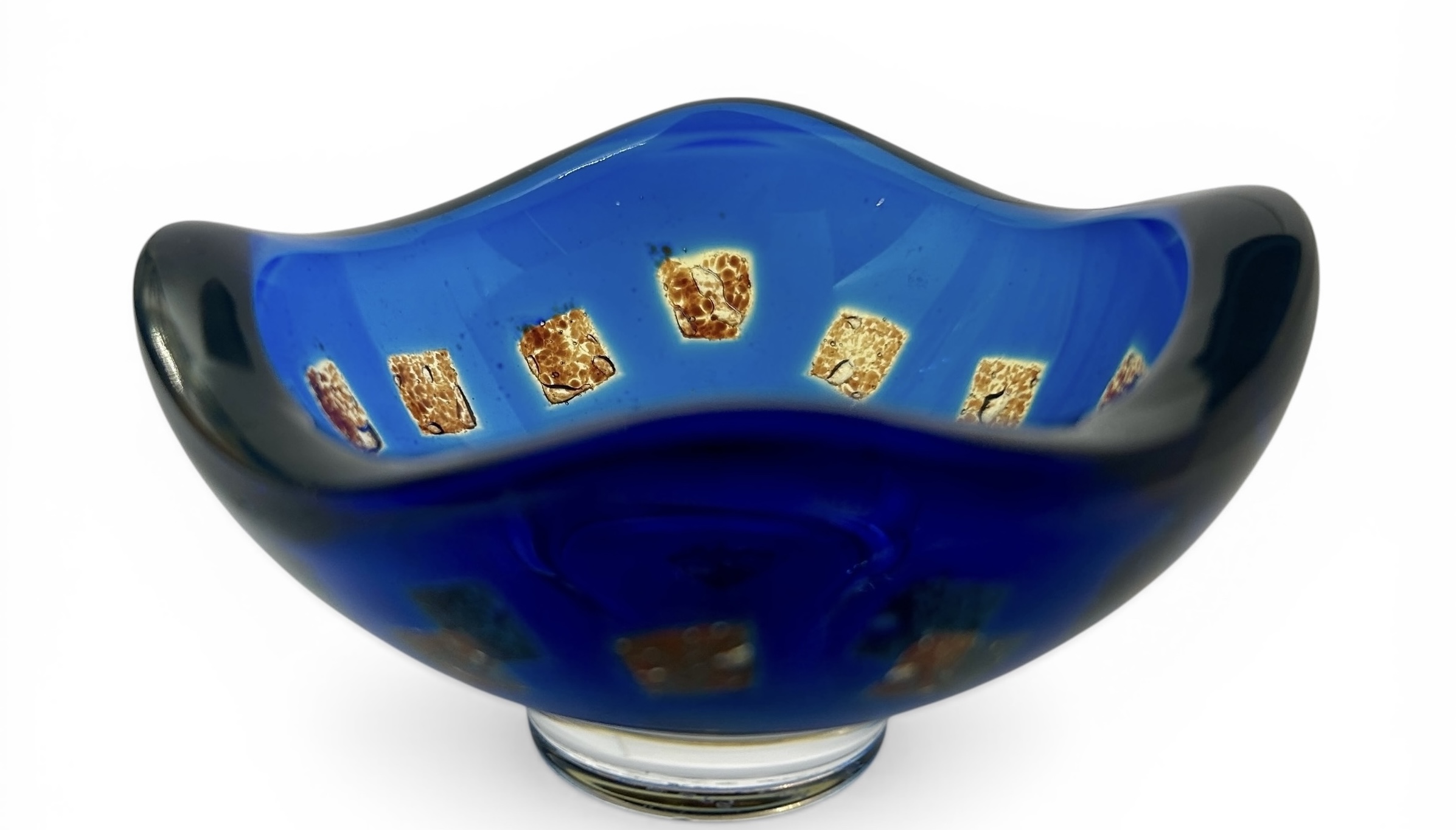 The pattern and colours indicated that it was from Orrefors’ legendary Ravenna range, which is identified from the geometric, grid-like formation of small decorated squares on a (usually) blue body. Typical of mid-century modern Scandinavian design, the forms are rounded, organic and often slightly asymmetric. Most forms are bowls, allowing the light to enter and play properly with the pattern and colours.
