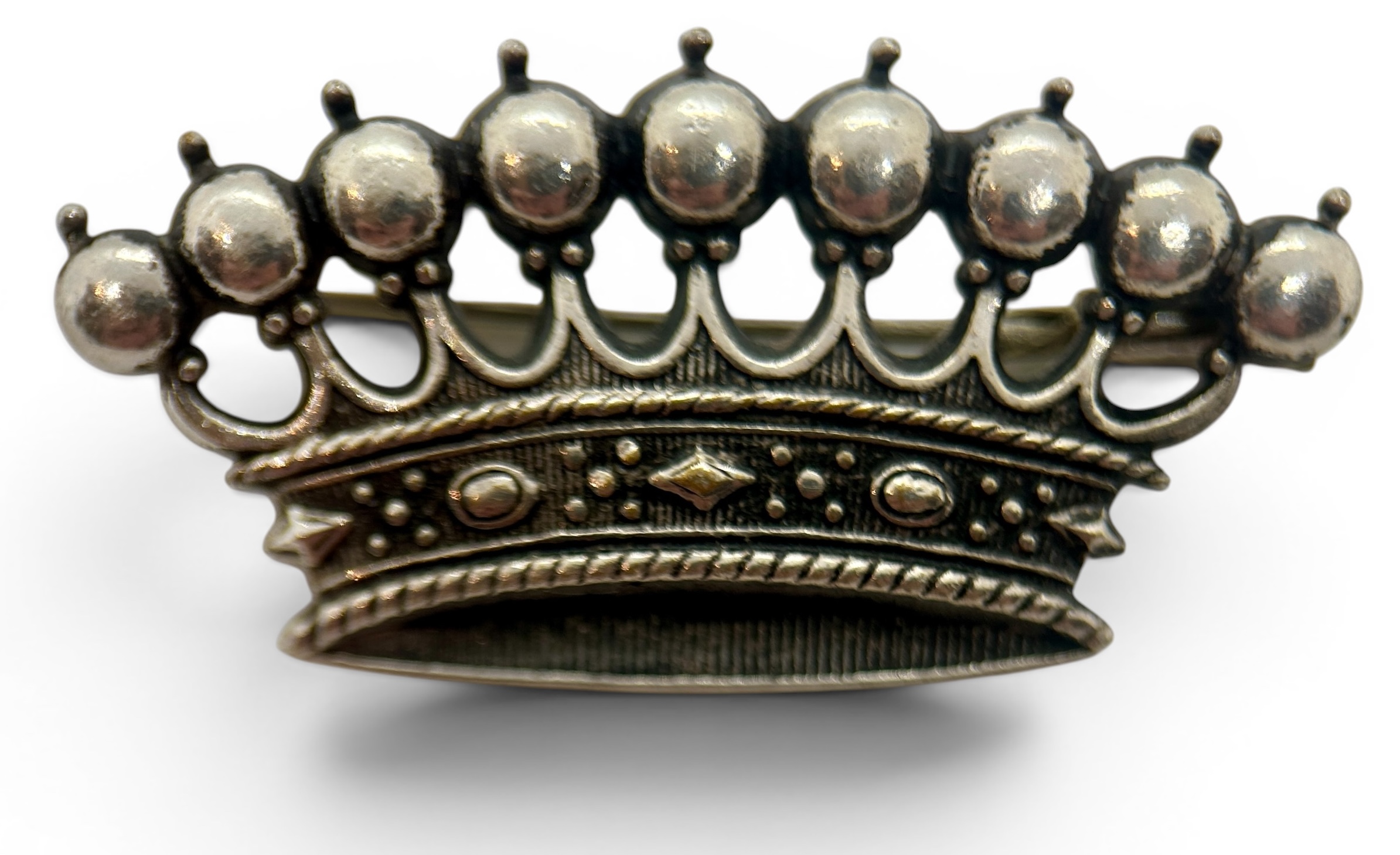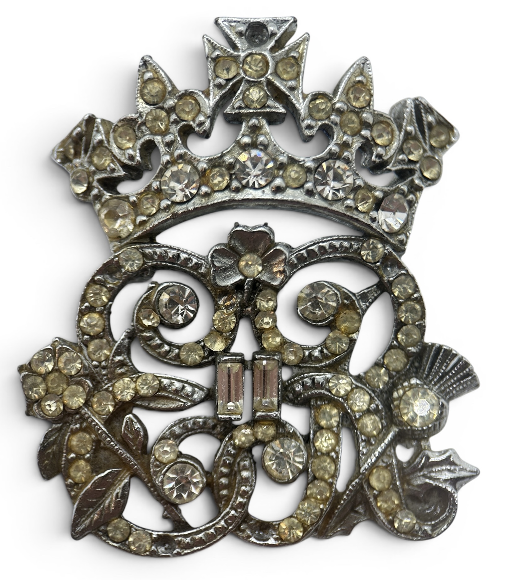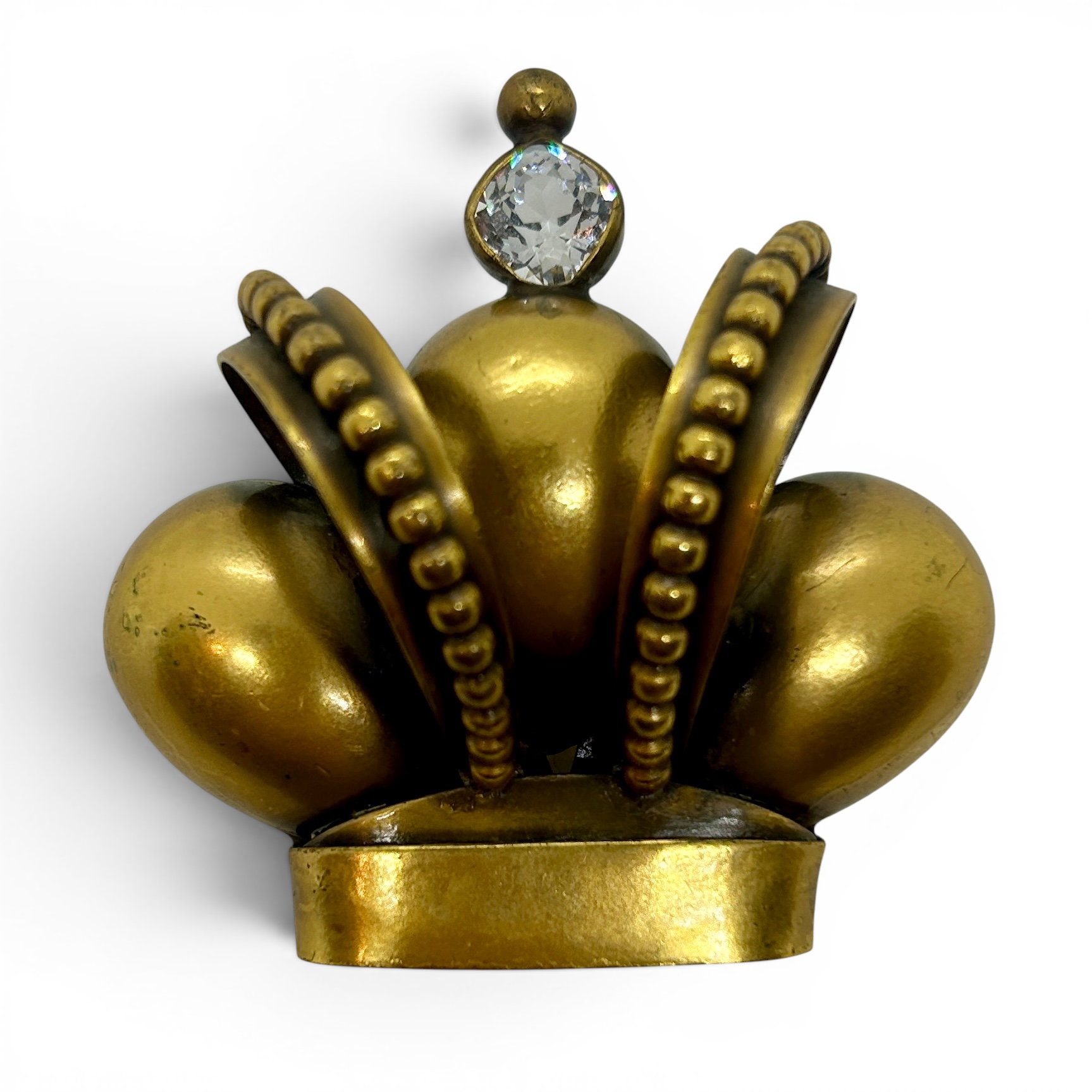 But there’s one crown pin that stands head and shoulders above the rest – and has a fascinating story to boot. The size catches people’s eyes at first. At 2 inches high and 2 inches wide, it’s not one for shrinking violets. But it’s not just the size, it’s the depth, as the crown’s arches stick out from your lapel by just over an inch, and it’s surmounted with a large sparking diamond-like rhinestone. But it’s a bit, well, brassy, right? How can that be interesting or valuable? Read on…